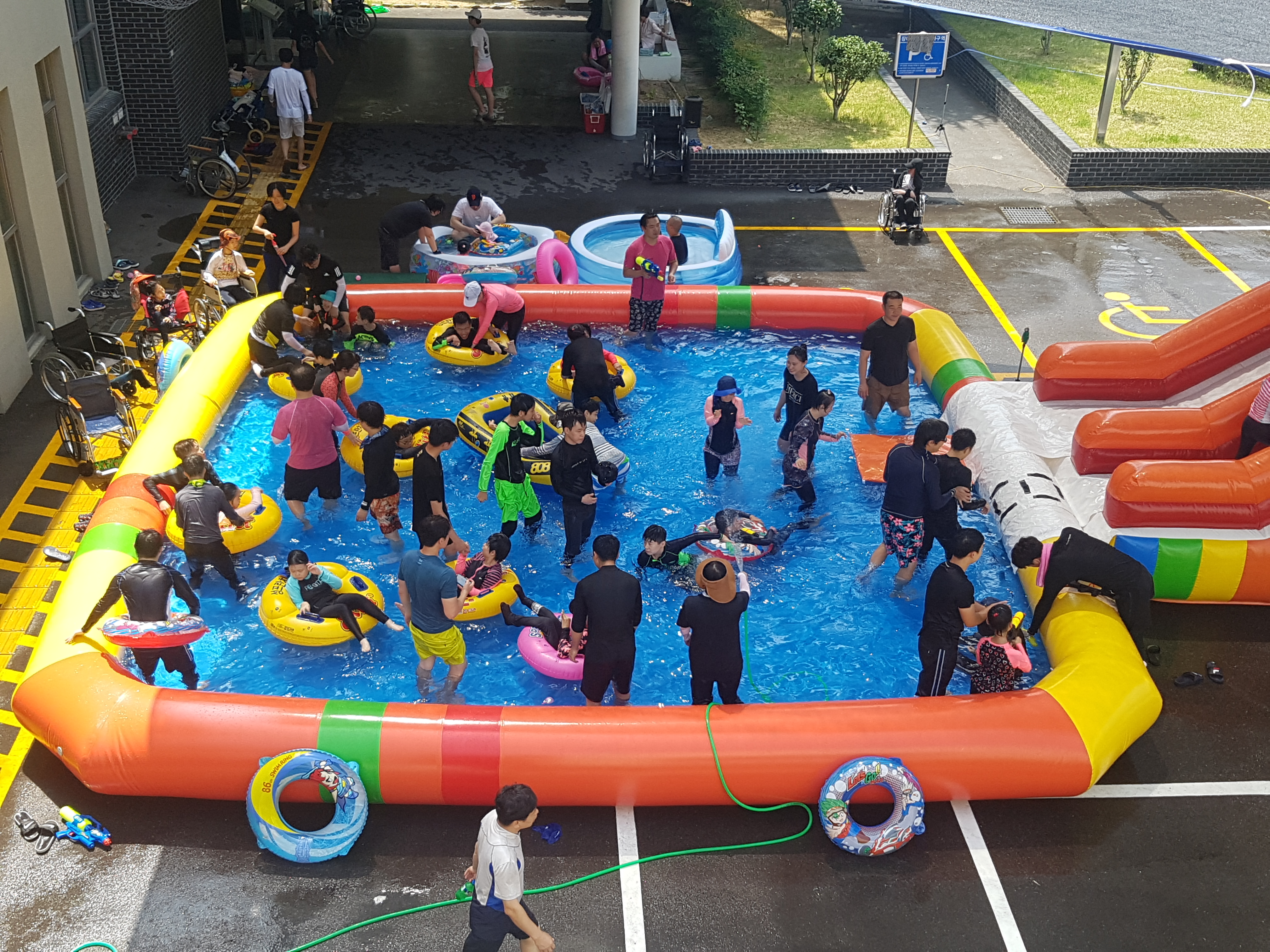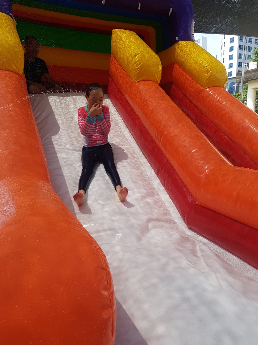 발조차 디딜 수 없는 뜨거운 날씨로인해 송정 바닷가로 계획되었던 여름 캠프를 원 내에 에어바운스를 설치하여 물놀이 하는 것으로 변경하였습니다.