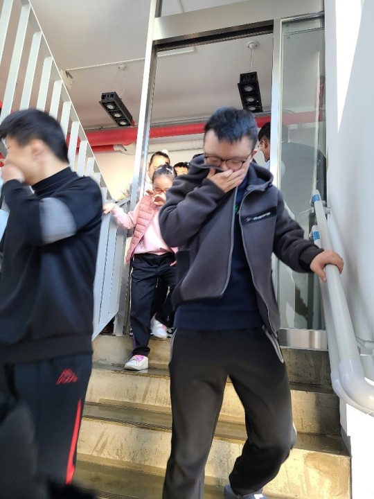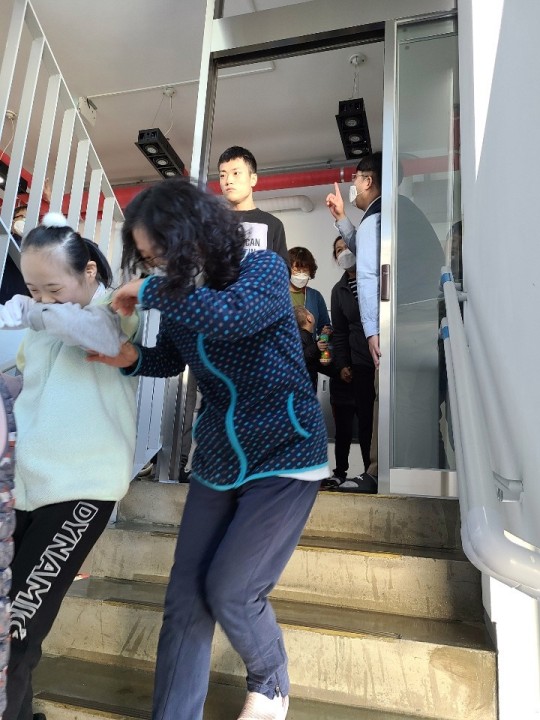 실제 상황처럼 2층에서 계단을 이용해 내려오는데 팔로 입을 막고 상체를 숙인상태로 대피하는게 쉽지 않았지만 최선을 다하는 우리 가족들입니다.