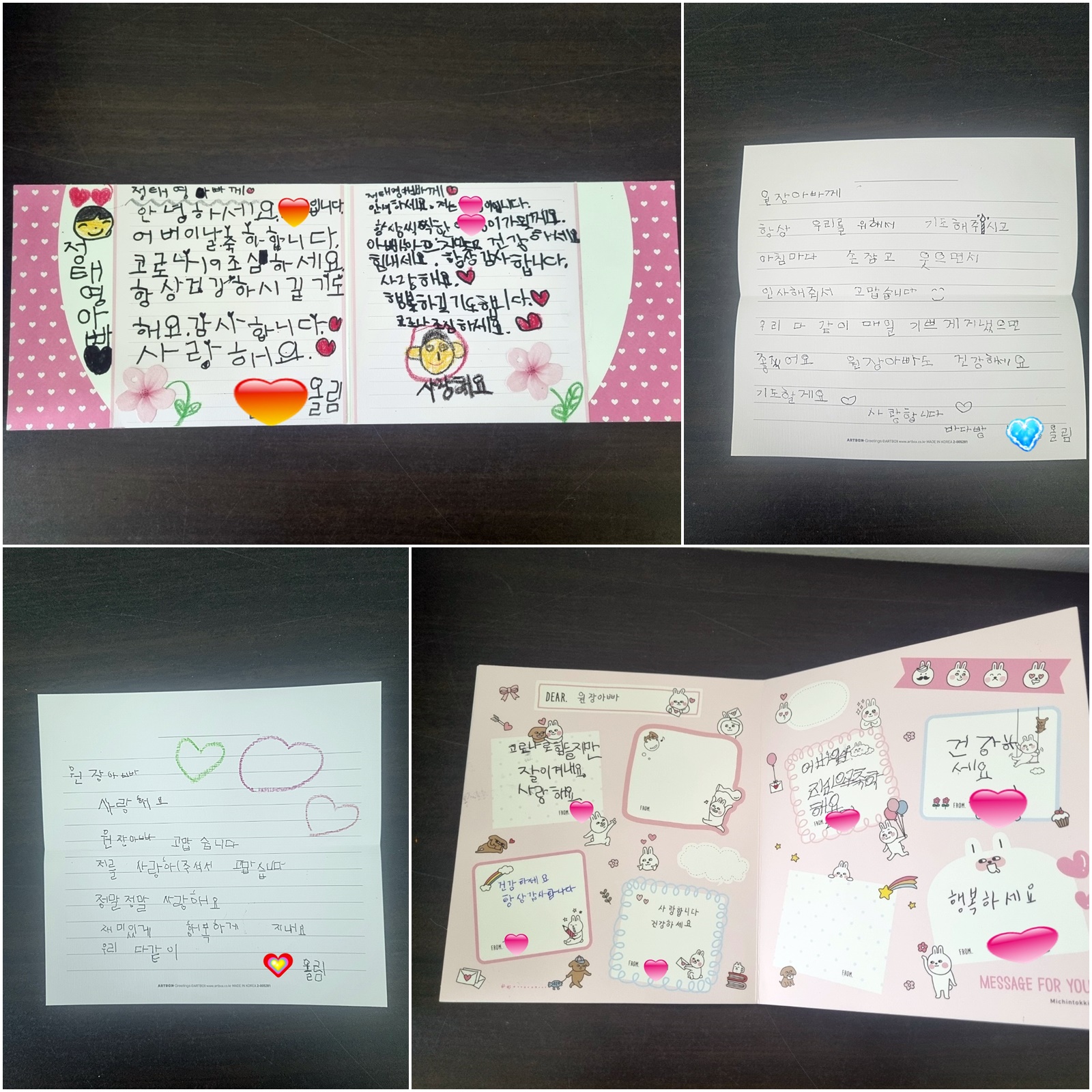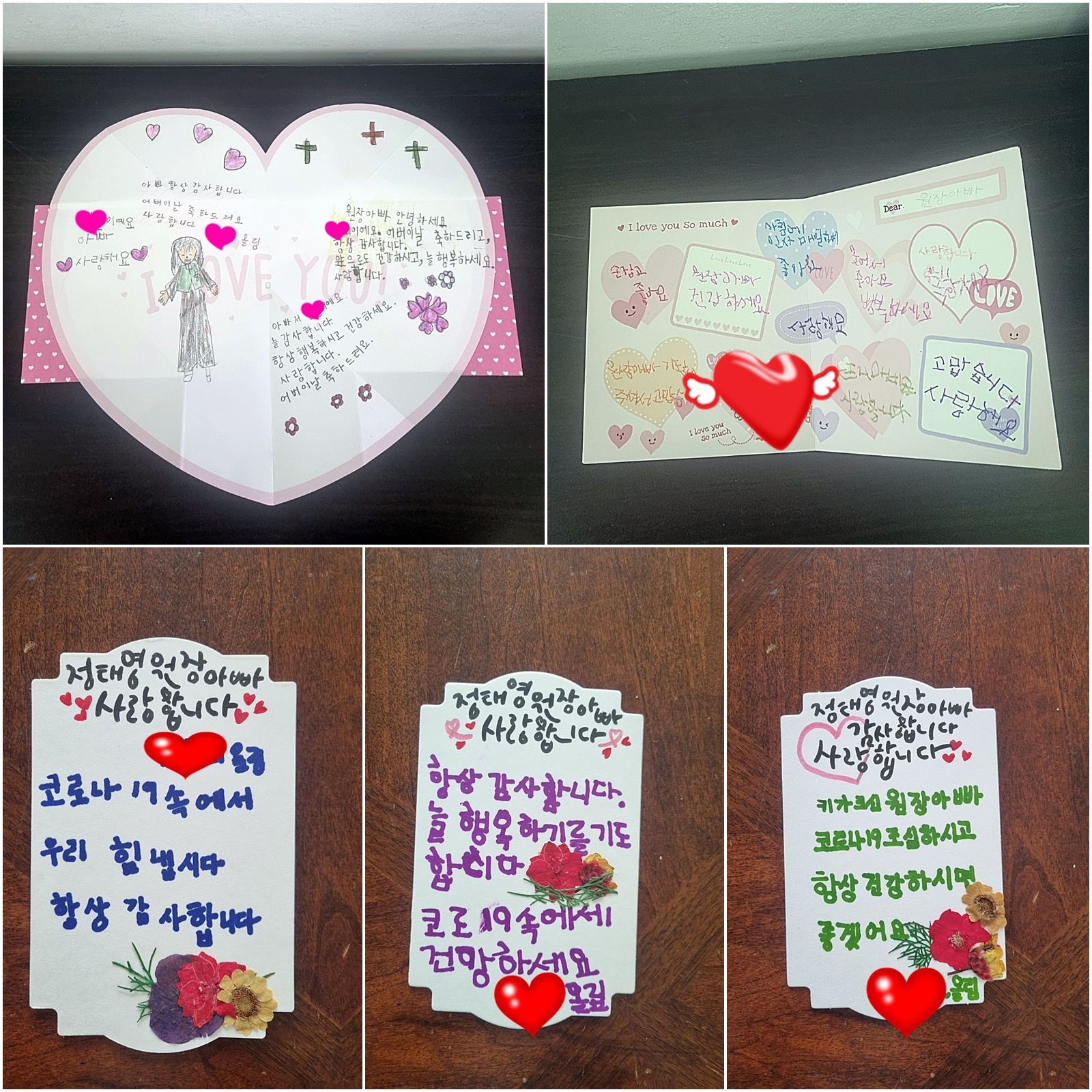내일 어버이날을 앞두고 가족들이 원장아빠께 쓴 편지입니다.