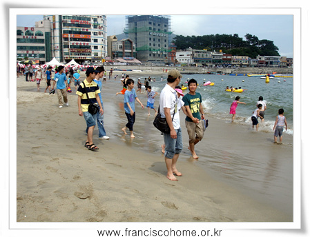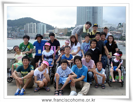 바다에 뛰어들어갔지요. 휠체어 가족들은 발만 담그거나 산책을 했어요.