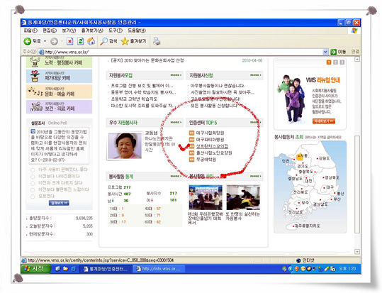 어제도 변함없이 봉사활동 실적을 입력하고 난 후 무심코 VMS의 메인화면을 봤더니 우리 인증센터가 3위에 랭크되었습니다.