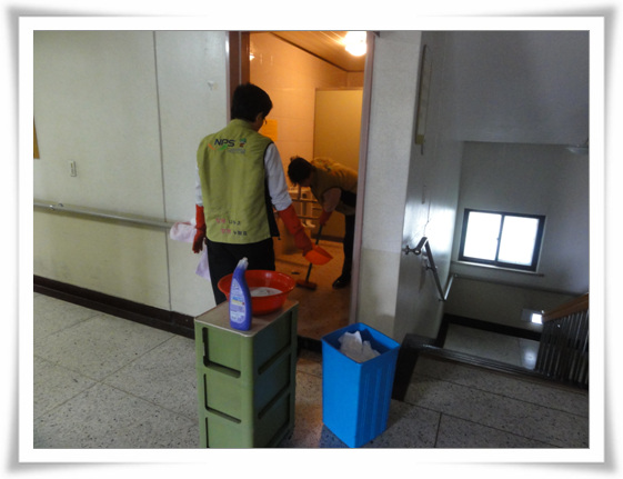 바닥에 놓여있는 물품을 빼내고 어찌나 깨끗하게 청소하시는 지요~저희가 좋아하는 모습을 보며 보람을 느낀다는 국민연금 남부산지사 봉사자님들이십니다.^^